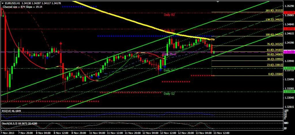EUR/USD pair is now down trend. The price already touched daily pivot point (1.34159). I think the price may touch Fibonacci 50.0 level (1.34069) and lower trend line.