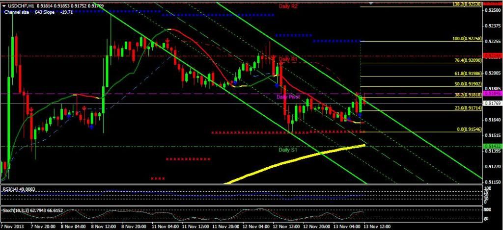 USD/CHF pair is now down trend. The price already touched daily pivot point (0.91845) and upper trend line. I think the price may touch Fibonacci 23.6 level (0.91714).