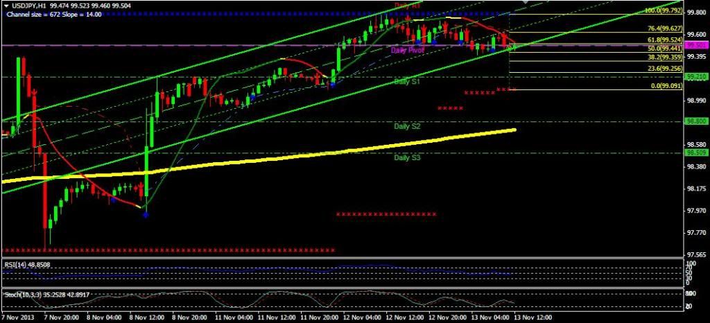 USD/JPY pair is now down trend. The price already touched daily pivot point (99.501). I think the price may touch Fibonacci 50.0 level (99.441) and lower trend line.
